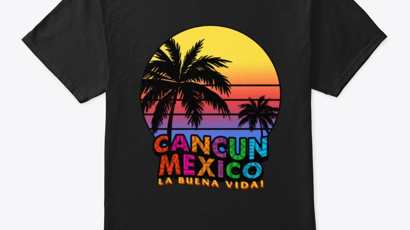 The shirt has a late day sunset with the shadows of palm trees. The words Cancun, Mexico in bright colors and the words “The Good Life” in Spanish.